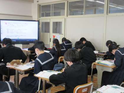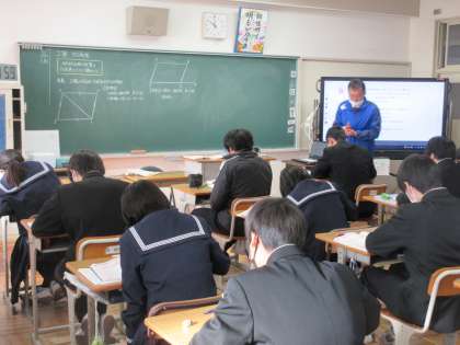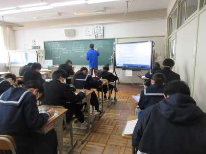 「平行四辺形の性質をその定義をもとに調べよう」というテーマで学習を進めていました。仮定・結論・証明の順に、筋道を立てて問題を解決していく生徒たち。まずは、自分の力で、次に友達と考えを交流させながら、問題解決を目指していました!