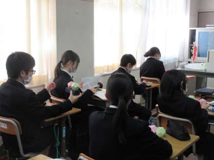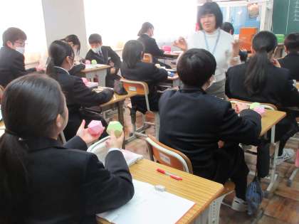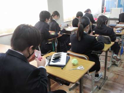 1月22日(月)今日の授業風景 その6 公開日 2024/01/22 更新日 2024/01/22 お知らせ 1年生の数学科の授業です。 「正多面体つくって観察しよう」というテーマのもと学習を進めていました。実際につくって多面体を見ながら、面の数や形、辺や頂点などの数を調べる生徒たち。上手く正多面体もつくりあげることができたようです。手元の立体を見ながら、今日の課題の追究を熱心に行っていました。