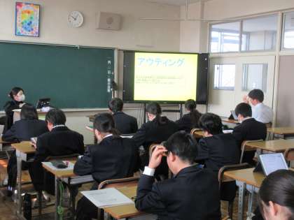 1月23日(火)今日の授業風景 その3 公開日 2024/01/23 更新日 2024/01/23 お知らせ 1年生の道徳科の授業です。 「誰もが自分らしく生きられる社会へ」をテーマに学習を進めていました。「性の多様性」について、考えを深めています。ちょうど、教室を訪問した時は、「性の多様性」の実話を聞き「アウティング」の影響について考えている場面でした。真剣な表情で話を聞く生徒たち。自分の考えを大きく広げていくことでしょう!