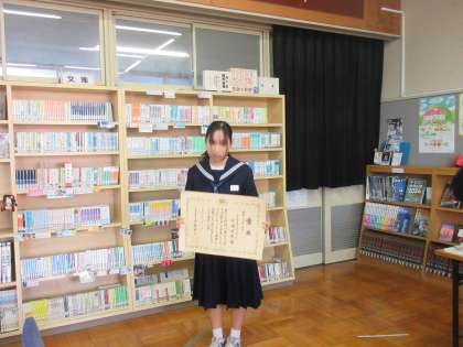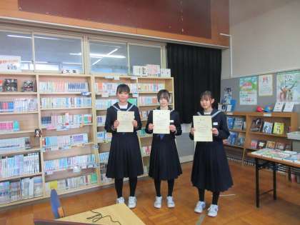 1月24日(水)第8回表彰 公開日 2024/01/24 更新日 2024/01/24 お知らせ 朝の時間を活用し、図書室と教室をオンラインでつなぎ、表彰を行いました。堂々とした姿勢で賞状を受け取る生徒たち。それぞれの場所で、目標をもち、一人一人の力を伸ばしているなと感じました!