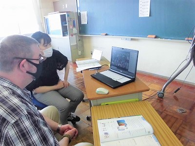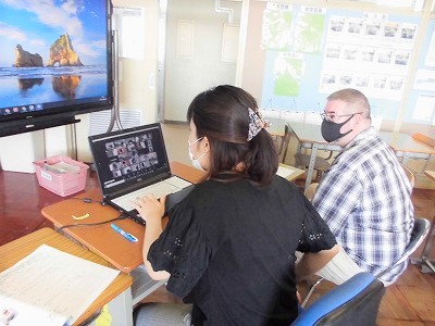 1年生の英語の授業です。ALTの質問に仲間達は画面越しに答えています。頑張って!