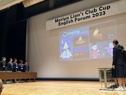 1月27日(土)守谷ライオンズカップ イングリッシュフォーラムでの活動の様子 その4 公開日 2024/01/27 更新日 2024/01/27 お知らせ 2年生、ラストのラウンドに出場した生徒たち。忘れられないメモリーを生き生きと楽しくプレゼンしていました。終わったあとの5人の笑顔が溢れる姿がよかったです!対戦チームの質問にも、堂々と答えていました。
