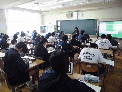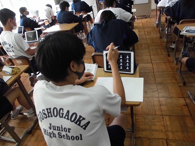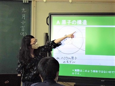 3年生の理科の授業です。今日は,原子の構造について学んでいます。タブレットを活用し,仲間の意見を共有しています。