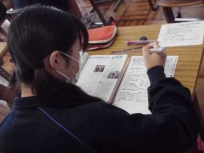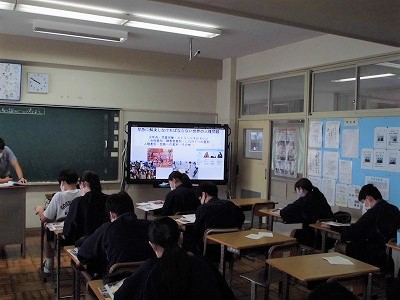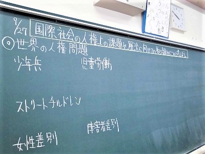 3年生の社会の授業です。公民分野です。今日は,国際社会の人権上の問題や解決に向けての取り組みについて考えています。電子黒板の掲示資料や教科書,資料集を活用して仲間達は真剣に考えています。頑張って!