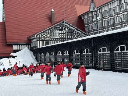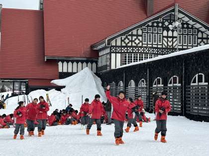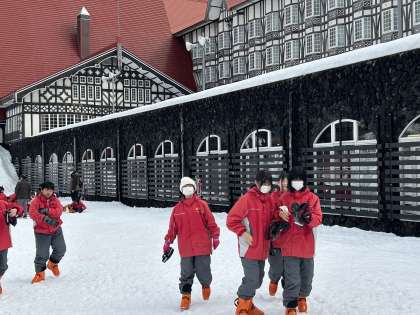 帽子や手袋、ゴーグルの返却。ホテルを背景に。