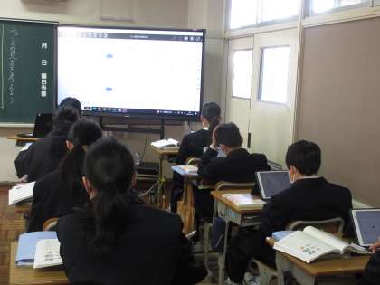 2月15日(木)今日の授業風景 その4 公開日 2024/02/15 更新日 2024/02/15 お知らせ 1年生の国語科の授業です。 「ニュースの見方を考えよう」というテーマのもと学習に取り組んでいました。タブレットに映し出された2つのニュース記事を見比べながら、その印象を比べる生徒たち。伝えたい意図に合わせて表現することについてイメージを広げていました。