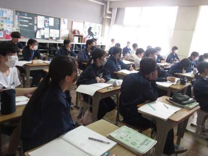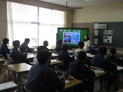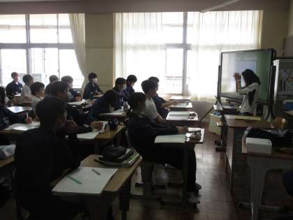 「自然の恵みって?」をテーマに学習を進めていました。担当の先生が映し出す四季を感じさせる自然の写真。生徒たちは、そこから季節に関する言葉を積極的に発表し考えを広げていました。太陽・地形・気候などをキーワードに、自然へのイメージを広げる生徒たちです。