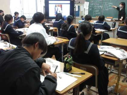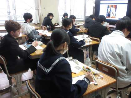 「フランス社会は、革命の後、どのような変化をしたか」というテーマで学習を進めていました。教室を訪問した時は、絶対王政の頃のフランスの状況をイメージしていました。挿絵や身分を表す図をもとに、当時のフランス社会の様子へのイメージを広げる生徒たちです!