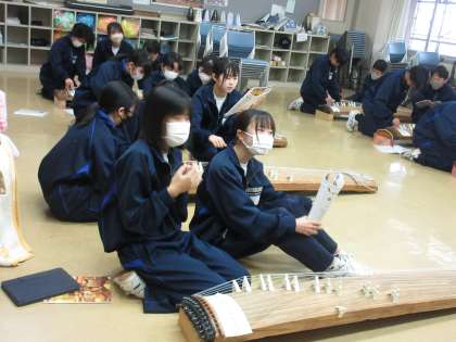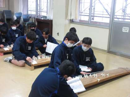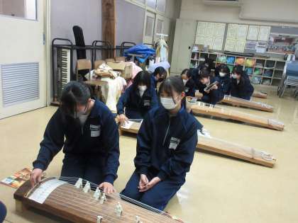 2月21日(水)今日の授業風景 その4 公開日 2024/02/21 更新日 2024/02/21 お知らせ 1年生の音楽科の授業です。 音楽してからは、今日も素敵な琴の音色が聴こえてきています。演奏曲は「さくら さくら」です。声を出しながら、みんなで琴の弦を弾きながら、演奏をしています。とてもいい感じでした!音楽室は、春そのものです!