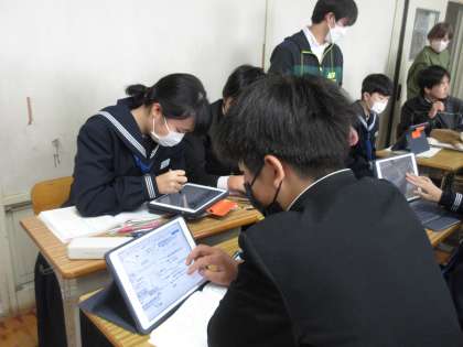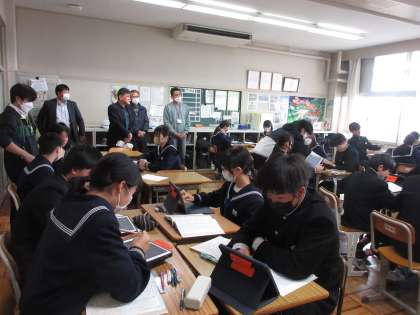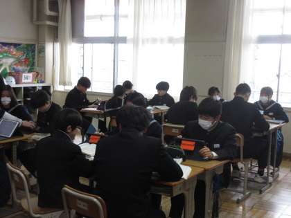 2月26日(月)今日の授業風景 その3 公開日 2024/02/26 更新日 2024/02/26 お知らせ 2年生の国語科の授業です。 (学校運営協力員の皆様にも授業を見ていただきました。) 「話し合って意見をまとめる」というテーマのもと学習を進めていました。リンクマップにまとめたメリットやデメリットをもとに、グループで話し合う生徒たちです。タブレットにまとめられたマップが印象的でした。一人一人の考えが広がっていました。