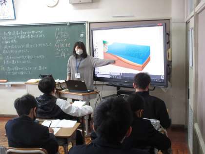 「地層はどのようにつくられるのだろうか」というテーマのもと学習を進めています。ワークシートに色をつけながらまとめたり、電子黒板に映し出されたイラストをもとに考えたり、熱心に活動するする姿が見られました。風化、浸食、運搬、堆積・・・などの地層に関する用語へのイメージも広がっていました。