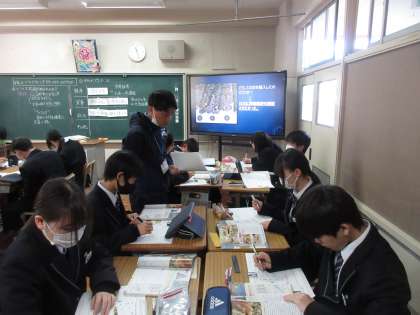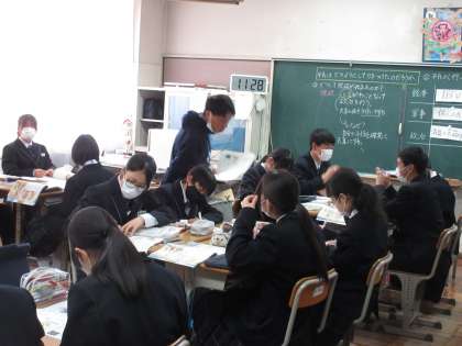 「平氏はどのように力をつけたのか」をテーマに学習を進めていました。平清盛が進めた経済・軍事・政治・・・について、調べたことをもとにどのような国づくりをしたかイメージを広げる生徒たち。今日の授業で学んだことを熱心にまとめる姿が印象的でした。