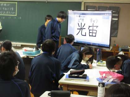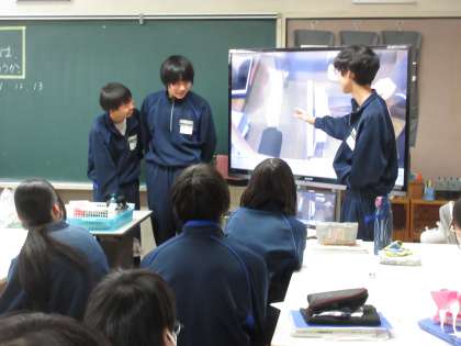 3月5日(火)今日の授業風景 その4 公開日 2024/03/05 更新日 2024/03/05 お知らせ 3年生の技術科の授業の続きです。 次のプログラムの発表は「光宙(ピカチュウ)」です。どんなプログラムか聞いていると、見通しの悪い夜のT字路での事故を防ぐプログラムです。見通しの悪いところでも、人感センサーを使い、光るシステムを考えた生徒たち。プログラムは完璧だったようです!素晴らしい発想に、またまた感動です!