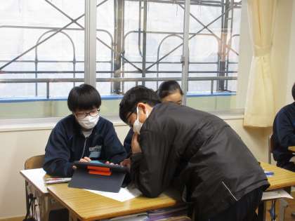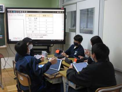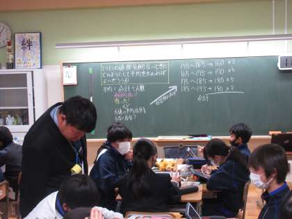 3月6日(水)今日の授業風景 その4 公開日 2024/03/06 更新日 2024/03/06 お知らせ 1年生の数学科の授業です。 「1つ1つの値から分からないときにどのように平均を求めていくか」という問いに向かって全力を尽くす生徒たち。「困った!」「分からない!」から、みんなでその解決方法を探っていました。「楽しみながら学習に取り組んでいるな!」と感じました。