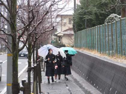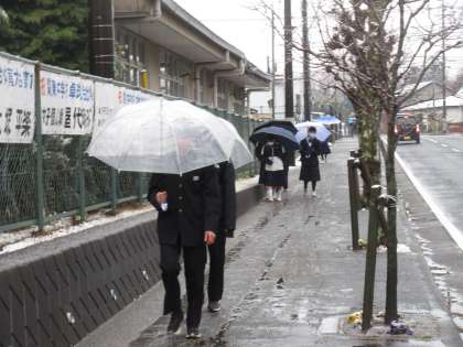 3月8日(金)朝の様子 その2 公開日 2024/03/08 更新日 2024/03/08 お知らせ 生徒たちは、雪がまじる雨の中、安全に登校することができました。地域の皆様の温かい見守りのおかげと思っております。今日も1日、頑張っていきます!