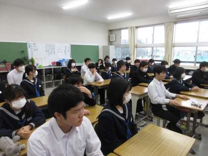 3月8日(金)朝の教室の様子【3年生】その5 公開日 2024/03/08 更新日 2024/03/08 お知らせ 日めくりカレンダーもラスト1日。生徒が日めくりカレンダーをもとに、今日の目標を話す姿が印象的でした!それを聞く生徒たちの姿勢もいいです!