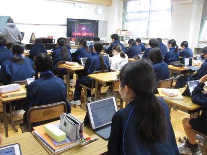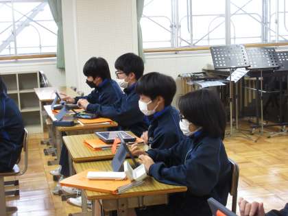3月12日(火)今日の授業風景 その3 公開日 2024/03/12 更新日 2024/03/12 お知らせ 1年生の音楽科の授業です。 「サンバのリズム」について、学習を進めていました。映像でサンバのリズムを確認した後、タブレットに音符を書き込んでいました。この後、実際にリズムも打ってみるようです。音楽室でも、積極的に課題に取り組む生徒たちの姿がたくさん見られました!