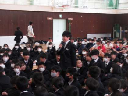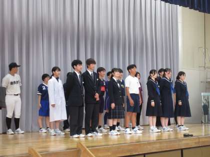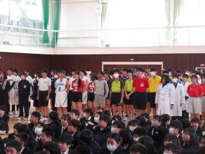 4月12日(金)新入生歓迎集会 その8 公開日 2024/04/12 更新日 2024/04/12 お知らせ 校歌をの紹介で2・3年生が校歌を歌う場面があったり、質問コーナーがあったり、1年生が中学校生活のイメージを広げる素敵な時間になりました!