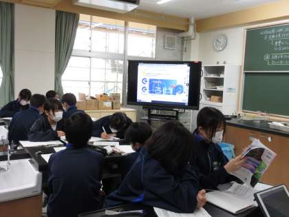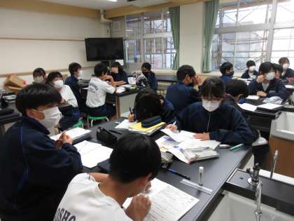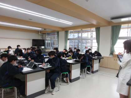「炭酸水素ナトリウムを加熱するとどのような変化が起こるだろうか」という課題のもと、日常生活と関係させながら、実験のイメージを広げる生徒たち。この後、実験ではガスバーナーも使うようです。しっかり、実験の進め方を確認する生徒たちです!