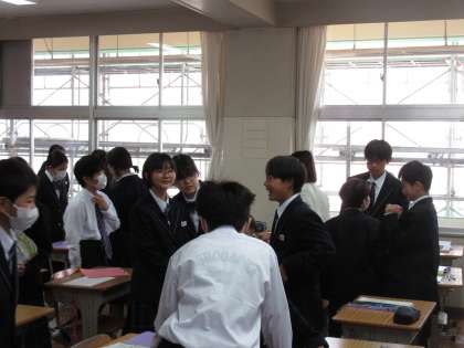 4月17日(水)今日の授業風景 その1 公開日 2024/04/17 更新日 2024/04/17 お知らせ 1年生の英語科の授業です。 「小学校で習った表現を使って、自分のことを伝え、相手のことを知ろう!」というテーマのもと、ペアをかえながら、英会話の活動に取り組んでいます。担当の先生の活動の進め方の話を聞き、笑顔で活動に取り組んでいました。