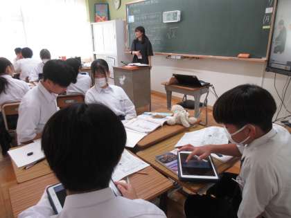 「受け取った刺激に対する人の反応時間」を調べていました。物差しが落ち始めてから、つかむまでの時間を記録した生徒たち。積極的に活動する姿が印象的でした。