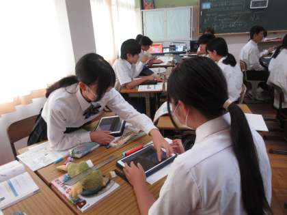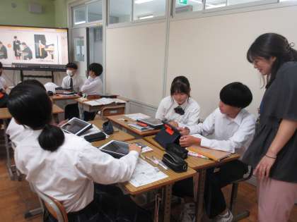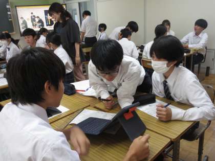 反応時間について、自分の結果を見ながら考える生徒たち。計算式で具体的な数字が出てくるので、その結果にわくわくです!グループ内で身を乗り出して計算に取り組む姿が印象的でした!