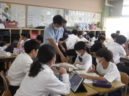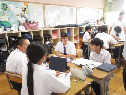 10月7日(月)今日の授業風景 その10 公開日 2024/10/07 更新日 2024/10/07 お知らせ 1年生の英語科の授業です。 「友達のことをみんなで紹介しよう!」というテーマのもと学習に取り組んでいました。年齢・住んでいるところ・趣味や好きなことを英語を活用して紹介し合う生徒たち。積極的に英語を活用しながら、活動している姿がよかったです!