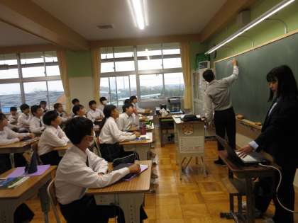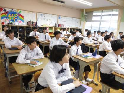 授業の最初はALTからの質問に応えるウオーミングアップから。今日の天気や月日など、集中して話を聞き、元気に声を出して答える生徒たちです!