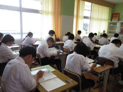 「比例とは何か?」をテーマに学習を進めていました。比例定数という新たに学んだ言葉をもとに、比例しているかどうか見分ける問題にチャレンジする生徒たち。比例定数も求めていきます。迷いながらも根気強く解決を目指す姿が見られました。