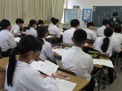 10月15日(火)今日の授業風景 その5 公開日 2024/10/15 更新日 2024/10/15 お知らせ 3年生の国語科の授業です。 「論語」の学習に取り組んでいました。「子曰わく・・・」から始まる論語をていねいに読み進める生徒たち。レ点や一・二点について確認し、より正確に読み進めようとしていました。落ち着いて、後期の授業のスタートをきる生徒たちです!