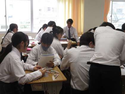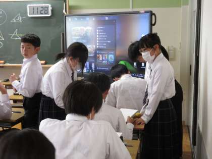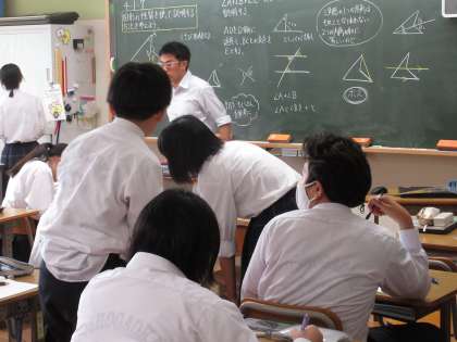 10月16日(水)今日の授業風景 その6 公開日 2024/10/16 更新日 2024/10/16 お知らせ 2年生の数学科の授業です。 「図形の性質を使って説明する」ことをテーマに学習を進めていました。「三角形の外角は、それととなりあわない2つの内角の和に等しい」という定理を活用して、頑張って説明を考える生徒たち。生徒どうしの協力体制もバッチリでした!