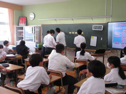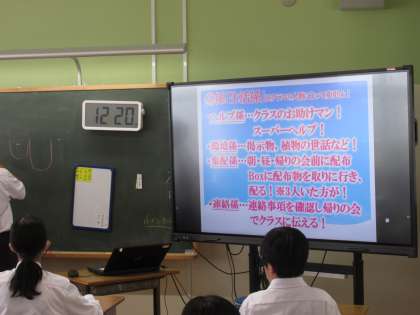 10月17日(木)今日の授業風景 その8 公開日 2024/10/18 更新日 2024/10/18 お知らせ (昨日、写真を撮った内容です。) 1年生の学級活動の時間です。後期の係活動を決めていました。生徒たちが中心になり、話し合いを進めている様子が見られました。どの係が何を行うか、電子黒板で確認できるところもいいところですね!