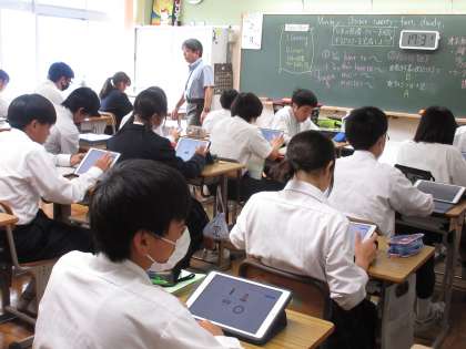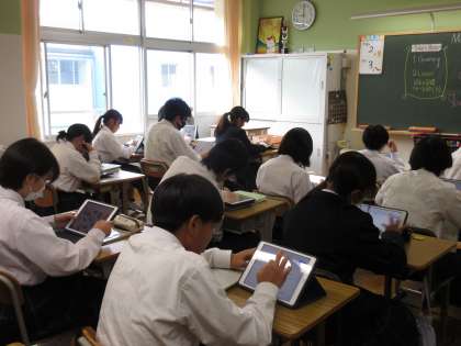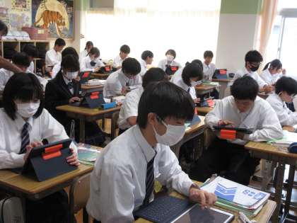 「日本の習慣やマナーを紹介するポスターを完成させよう!」というテーマのもと、学習したことを生かしてポスターをづくりです。「have to〜」「must〜」を活用し、目を引く、そして工夫したポスターをつくっていました。集中した雰囲気の2年生教室です!
