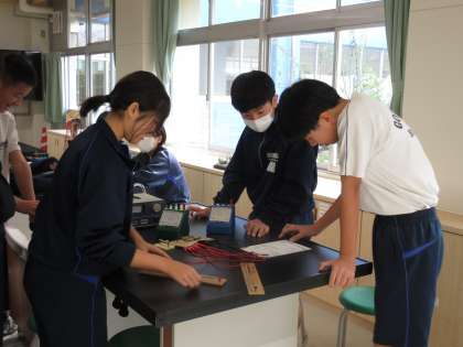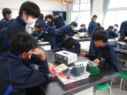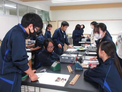 11月5日(火)今日の授業風景 その3 公開日 2024/11/05 更新日 2024/11/05 お知らせ 2年生の理科の授業です。 「回路の電流と電圧の大きさはそのような関係か」をテーマに学習を進めていました。理科室での実験に、グループで協力しながら取り組む2年生。電源装置・電圧計・電流計をつなぎ、回路をつくりあげ実験にのぞむ生徒たちです!