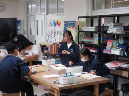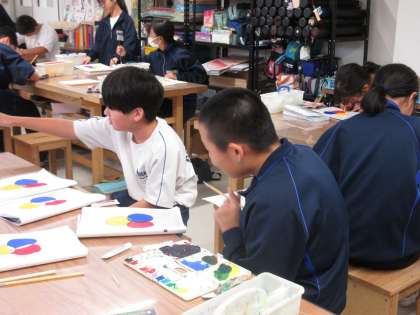 11月6日(水)今日の授業風景 その3 公開日 2024/11/06 更新日 2024/11/06 お知らせ 1年生の美術科の授業です。 「この世に色は何色あるだろう?」をテーマに学習を進めてきた生徒たち。色の3原色とその重なった部分の色をつくり出しながら、課題の追究をし続けていました。作品に書かれたたくさんの気付き。考えが深まったようです!