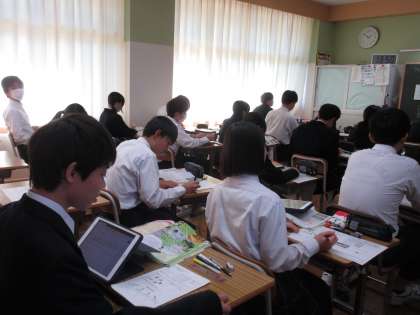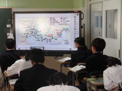 「なぜ中京工業地域が工業生産額が日本一か」をテーマに学習を進めていました。地図や資料から考えたことや気付いたことを最後にまとめる場面でした。工業製品出荷額が日本一の理由がつかめていました!