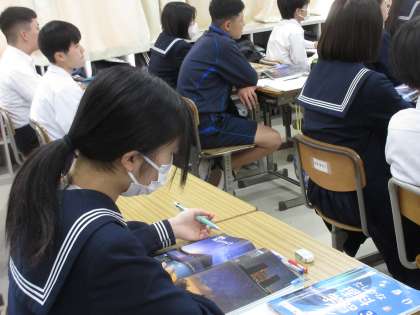11月8日(金)今日の授業風景 その1 公開日 2024/11/08 更新日 2024/11/08 お知らせ 3年生の理科の授業です。 「空を見上げてみよう」をテーマに学習を進めていました。教科書に掲載されている夜空の写真。「天の川」「ヘールホップ彗星」・・・などの写真を見て、星の世界へのイメージを広げる生徒たち。自分の考えを進んで発表しながら、授業が進んでいました!