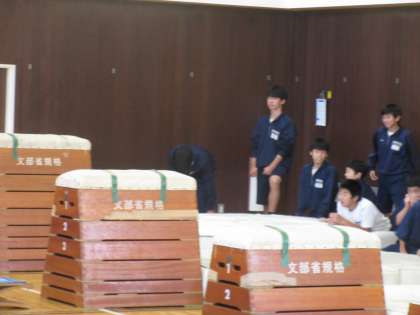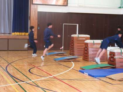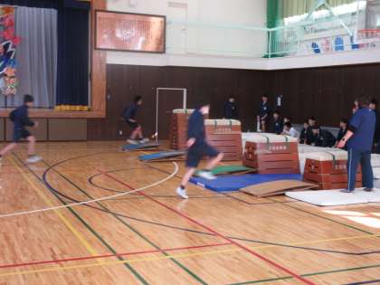11月13日(水)今日の授業風景 その3 公開日 2024/11/13 更新日 2024/11/13 お知らせ 2年生の体育科の授業です。 体育館では「跳び箱」の学習に取り組んでいました。跳び箱との高さを自分で選択し、開脚跳びにチャレンジ中でした。担当の先生の合図にしたがって、素早く動く生徒たち。頑張っていました!
