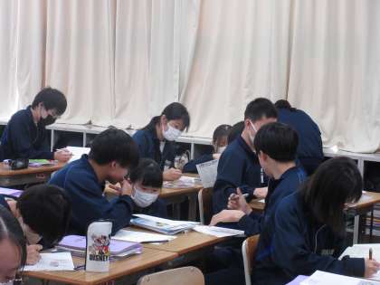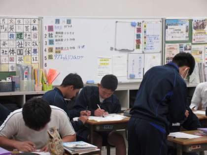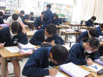 11月14日(木)今日の授業風景 その6 公開日 2024/11/14 更新日 2024/11/14 お知らせ 3年生の数学科の授業です。 今日は「これまでの学習の振返り」の時間です。プリントやワークに根気強く取り組む3年生。自分の力で粘り強く考える姿、友達と教え合う姿・・・など、最後までやり遂げる生徒たちの姿が見られています!!
