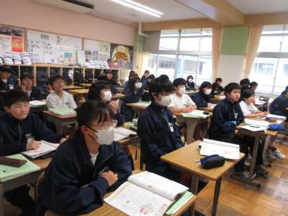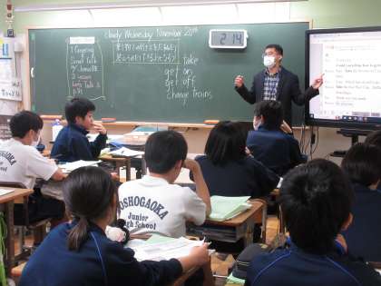 11月20日(水)今日の授業風景 その6 公開日 2024/11/20 更新日 2024/11/20 お知らせ 2年生の英語科の授業です。 「乗り物の乗り方を尋ねることができるようにしよう!」というテーマで学習に取り組んでいました。ちょうど教室を訪ねたときは、ALTの先生が話す英語のあとに、自分たちも英文を読む取組をしているところでした。元気よく英語の文を読む姿を見て、頑張っているなと感じました!