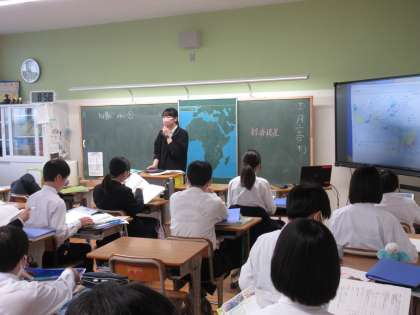 黒板には「アフリカ州」の地図が置かれていました。教室を訪問した時は、これまで学習してきた「アジア州」や「ヨーロッパ州」の多様な情報が書き込まれた白地図を見返している場面でした。(よくまとめていました!)これから、新たな学ぶ新たな州への見通しがもてたようです!