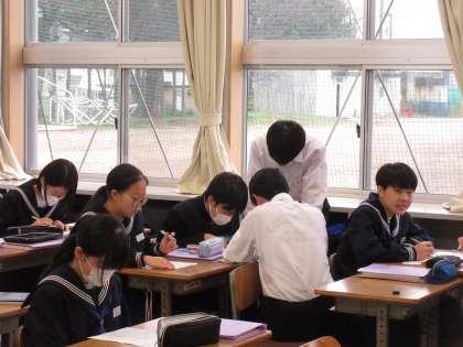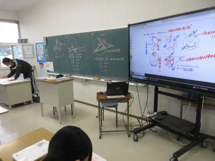 11月21日(木)今日の授業風景 その9 公開日 2024/11/21 更新日 2024/11/21 お知らせ 3年生の数学科の授業です。 円の中に描かれた図形の角度を求める問題に取り組んでいました。生徒たちの言葉から、円周角・中心角・内角の和・・・など、学習した内容を思い出しながら、問題の解決を目指していました。集中して学習に取り組む3年生の生徒たちです!