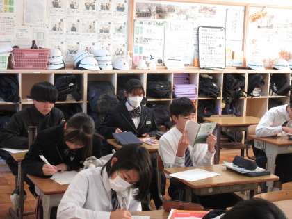 11月25日(月)朝の教室の様子 その2【2年生】 公開日 2024/11/25 更新日 2024/11/25 お知らせ 係の仕事や片付けなどが一段落すると、生徒たちは読書やテスト対策の学習に取り組んでいました。今日もよいスタートが切れているようです!