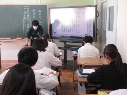 11月25日(月)今日の授業風景 その3 公開日 2024/11/25 更新日 2024/11/25 お知らせ 2年生の国語科の授業です。 「那須与一」の学習に取り組んでいます。古文にチャレンジです。今日は表現の特徴に気付いたり、那須与一の心情に迫ったりしていきます。当時の絵を見ながら、文章の読み取りを進める生徒たちです!