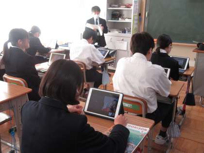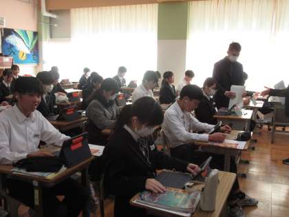 11月25日(月)今日の授業風景 その4 公開日 2024/11/25 更新日 2024/11/25 お知らせ 2年生の英語科の授業です。 オンライン英会話にチャレンジしていました。教室を訪ねると、生徒たちが画面の向こう側の外国の方と、英会話をする姿が見られました。英会話が教室全体に広がっています。今日のテーマは「〇〇 how to 〜」を使っての英会話です。頑張っています!