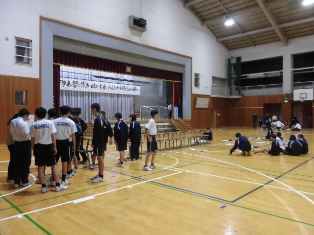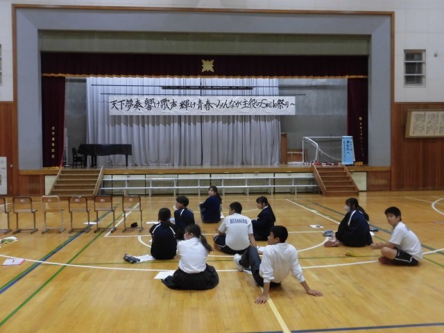 いよいよ今週金曜日は「けや輝祭」です。多くの生徒の皆さんの協力により、スローガン看板の制作を進めてきました。今日はその看板を体育館ステージに設置しました。スローガンは「天下夢奏 響け歌声 輝け青春 ~みんなが主役のSmile祭り~」です。一人一人が主役となれる「けや輝祭」になるよう、実行委員の皆さんは毎日のように準備を進めてくれています。
