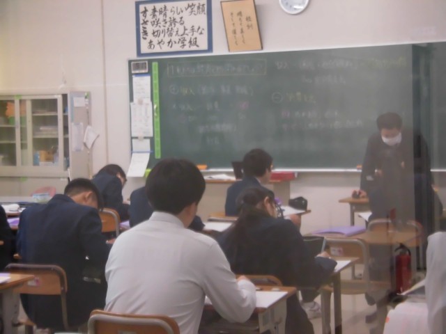 1年生の国語では、故事成語の「矛盾」について学習をしました。日常生活のどのような場面で「矛盾」という言葉を使うかについて、経験をもとに話し合っていました。3年生の社会は「経済」についての学習です。「収入と支出」について、生徒の皆さんの身近に起きている出来事と結びつけて考えていました。