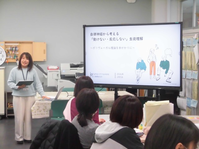 今日は生徒の皆さんが下校してから、教職員で校内研修を実施しました。研修テーマは「自律神経から考える生徒理解」です。講師にスクールカウンセラーの先生をお招きし、講話をいただきました。今日の研修で学んだことを生かし、これからもチーム学校で「Smileあふれる学校」を目指していきます。