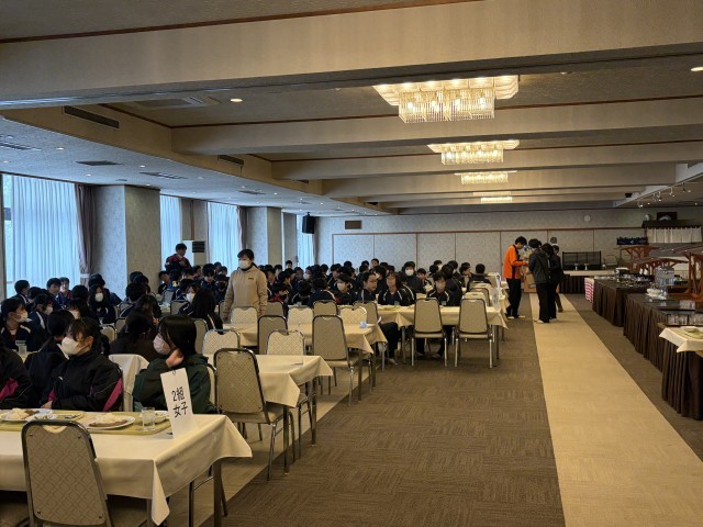 途中、渋滞もありましたが、予定通り12時にホテルに到着しました。昼食後入館式を行い、スキー学習に入ります。
