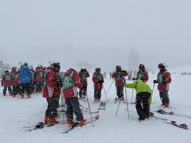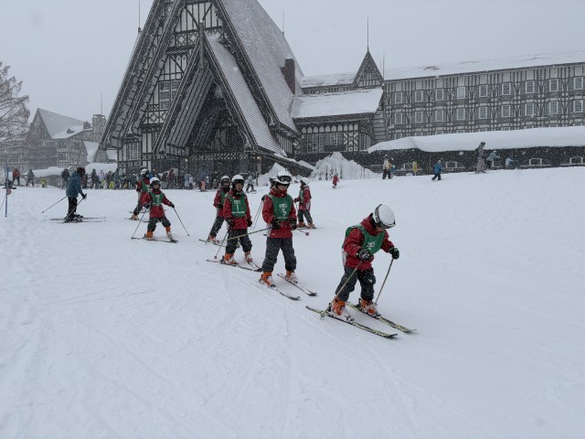 クラスごとに記念写真を撮った後、いよいよスキー学習です。順番運動を念入りに行い、インストラクターからスキー板の履き方、ストックの持ち方等を教わりました、まずは板を履いて歩く練習からです。グループによっては、ボーゲンで滑り始めました。